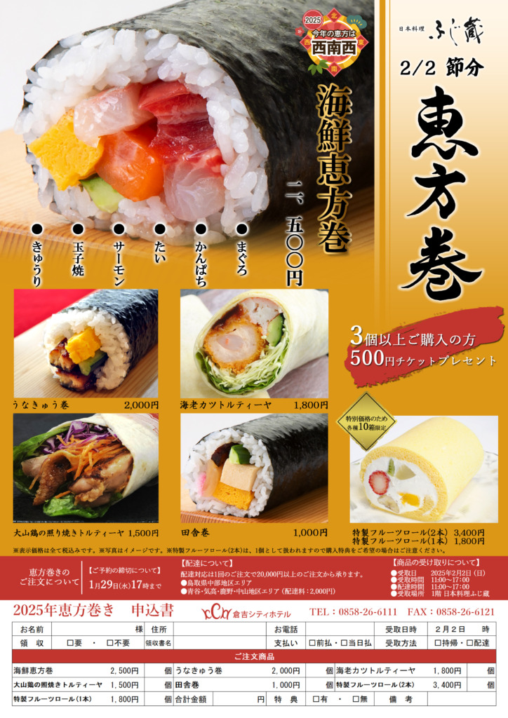 倉吉シティホテルは恵方巻を数量限定にて予約販売いたします。