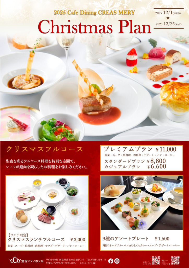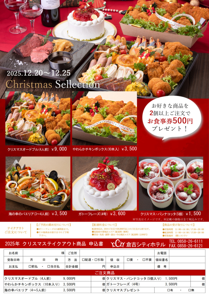 倉吉シティホテルは、クリスマスシーズンにお楽しみいただけるテイクアウト商品とレストランでお召し上がり頂ける限定ランチとフルコースのご予約を承ります。