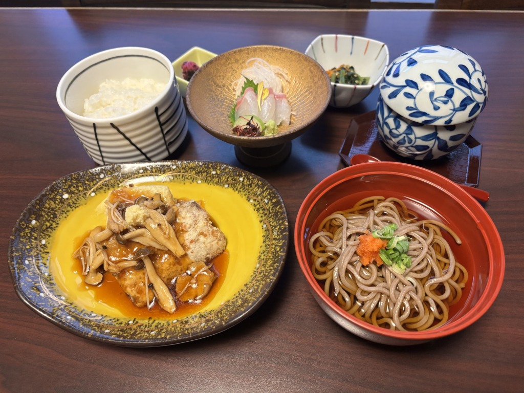 小鉢/造里/秋刀魚と豆腐のきのこ餡かけ/蕎麦/茶碗蒸し/御飯/香の物