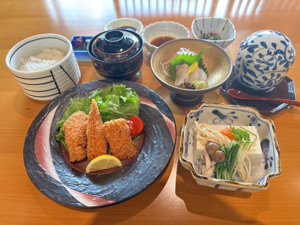 小鉢/造里/鮭フライ/湯豆腐/茶碗蒸し/御飯/味噌汁/香の物