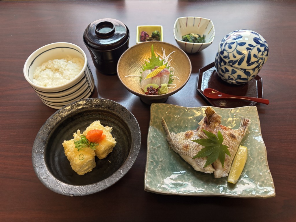 小鉢/造里/鯛カマの塩焼き/揚げ出汁豆腐/茶碗蒸し/御飯/味噌汁/香の物