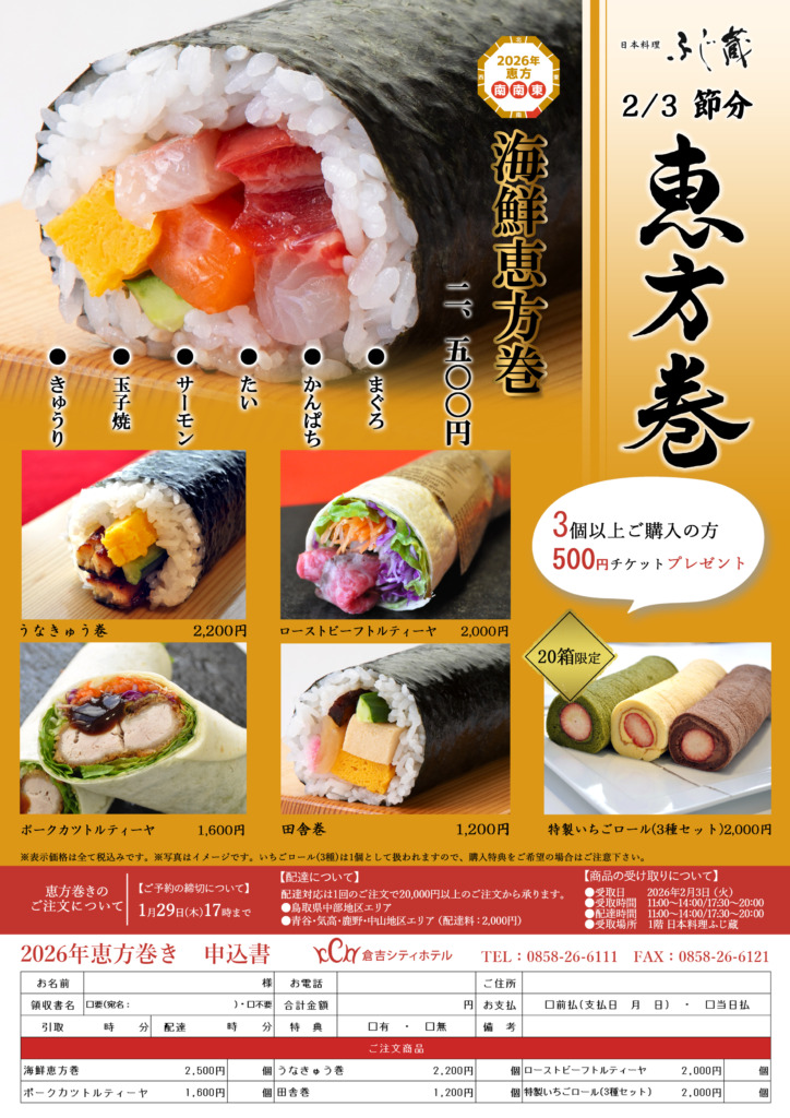 倉吉シティホテルは恵方巻を数量限定にて予約販売いたします。