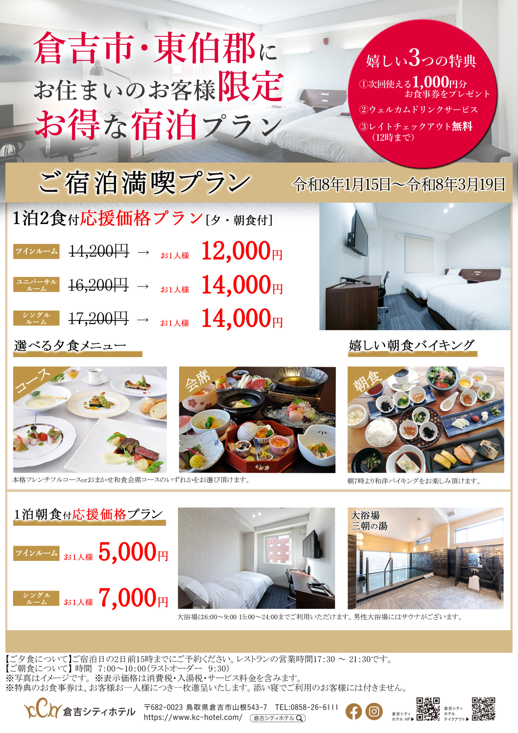 倉吉市・東伯郡にお住まいのお客様限定宿泊プラン(1/15~3/19)