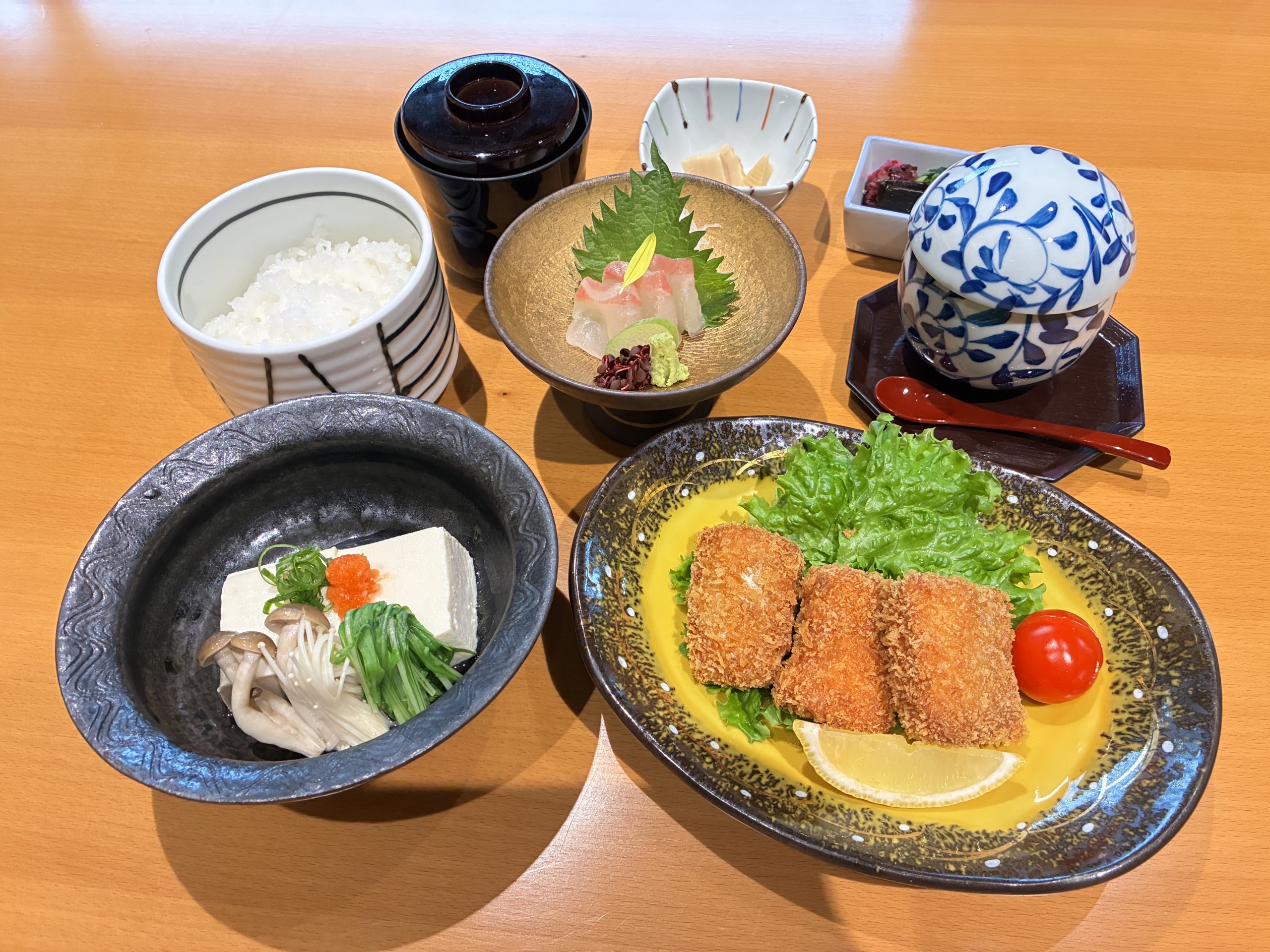 小鉢/造里/鮭フライ/湯豆腐/茶碗蒸し/御飯/味噌汁/香の物
