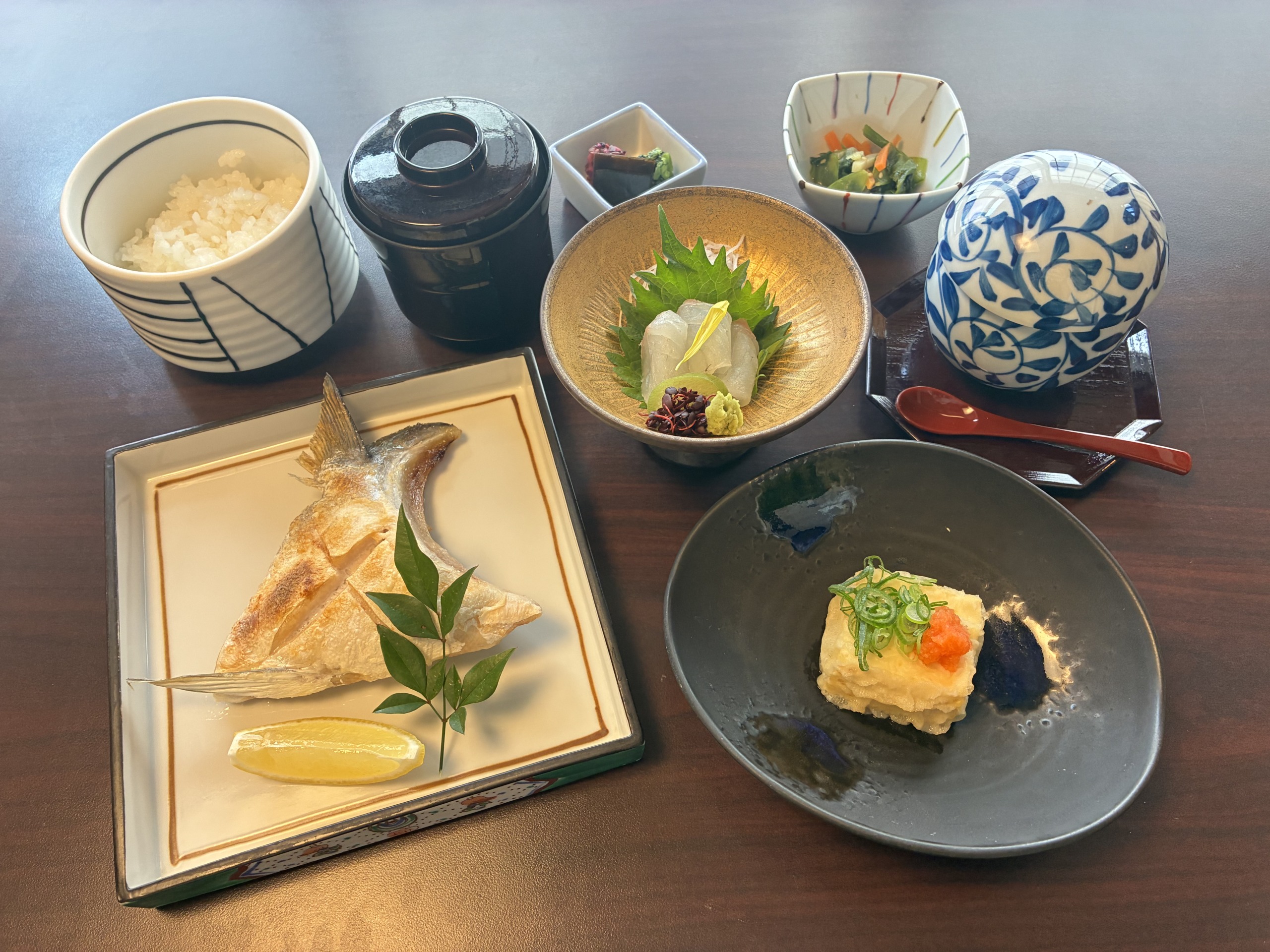 小鉢/造里/はまちのカマ塩焼き/揚げ出汁豆腐/茶碗蒸し/御飯/香の物/味噌汁