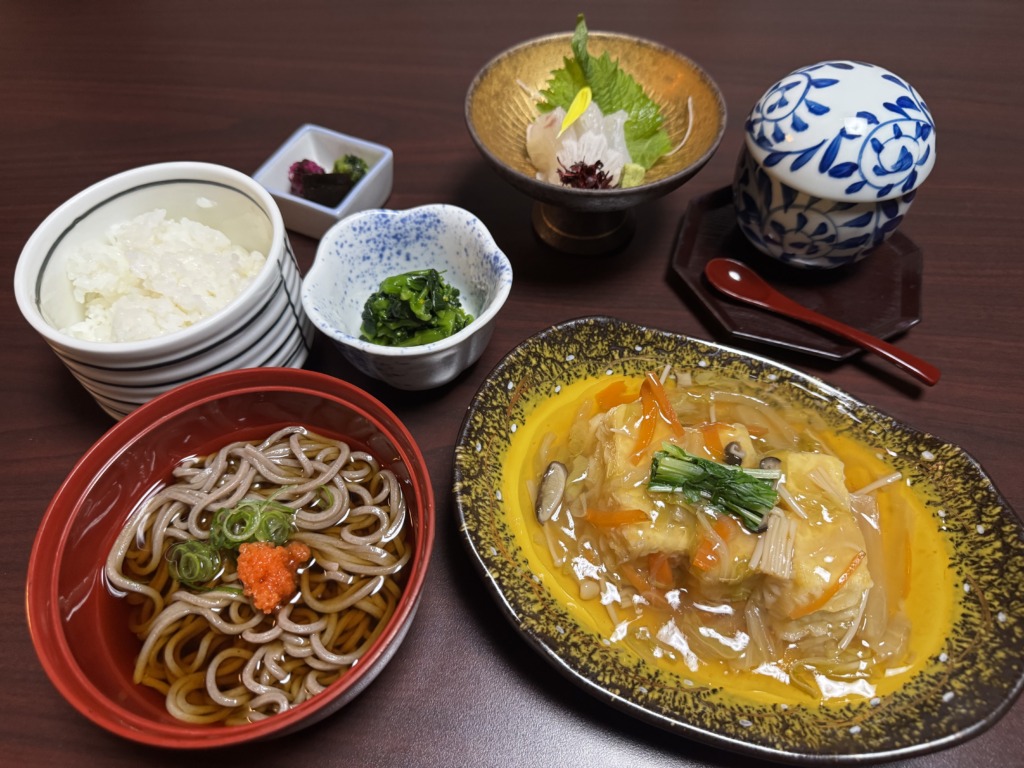 小鉢/造里/揚げ豆腐あんかけ/蕎麦/茶碗蒸し/御飯/香の物