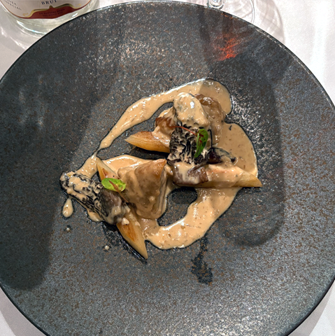 前菜 ホワイトアスパラガス モリーユ茸とリードヴォーのフリカッセ