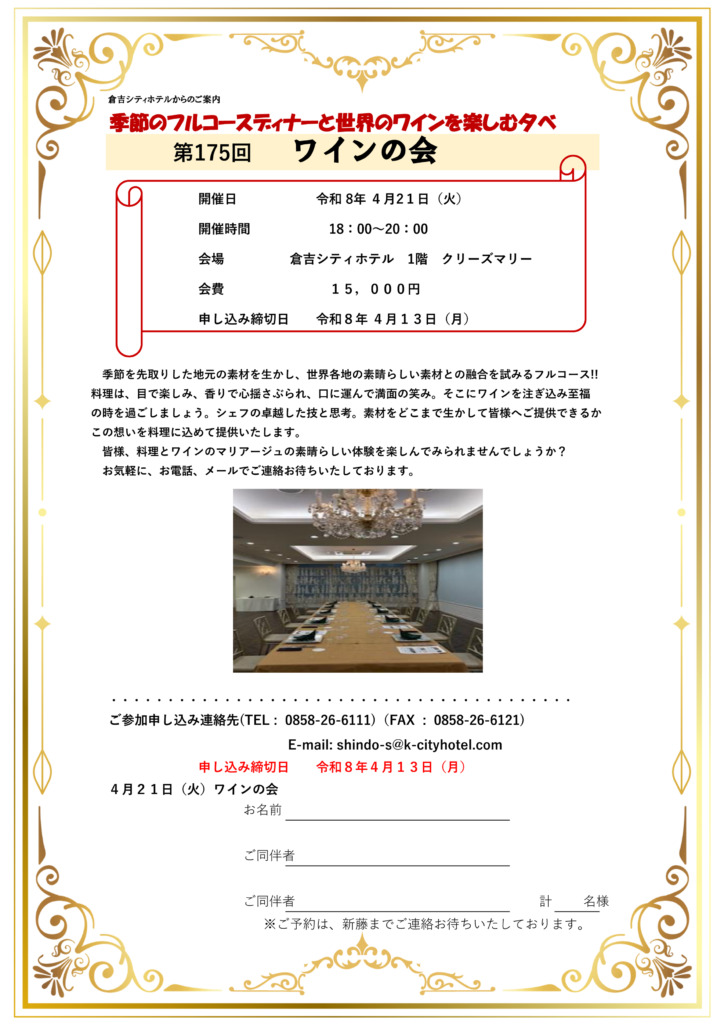 倉吉シティホテルではワインの会を楽しむ会を開催いたします。