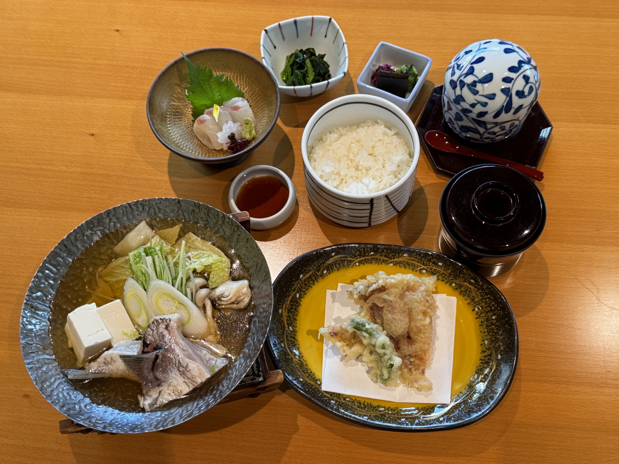 小鉢/造里/鯛カマの潮鍋/イカの下足天婦羅/茶碗蒸し/御飯/香の物